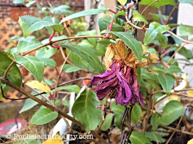 Even if you have a greenhouse or a sunny porch, give the fuchsias a rest. Fuchsias appreciate the down time while the light’s dim. Your main goal is just keeping them alive—not blooming—though the winter gloom. They won’t even need light during their long winter’s nap. Hopefully not too long a nap, for the impatient gardener’s sake as well.